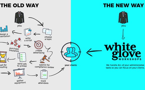 New for 2021 White Glove top-rated live seminar events and webinars for financial advisors and other professional advisors. Together as a team we are able to collaborate and offer a one of a kind service to help people across the nation---we also just expanded our services internationally. Workshop hosts are prohibited from over-promoting their services or business during the presentation.